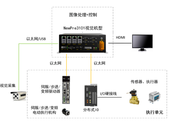 隨著工業(yè)自動化技術的發(fā)展,機器視覺作為人工智能技術中特點鮮明的代表應用正在滲透到工業(yè)自動化領域各個分支中。傳統(tǒng)的機器視覺系統(tǒng)由視覺采集單元、圖像處理單元、控制單元、執(zhí)行單元四部分組成,東土NewPre3101系列視覺機,在功能上將圖像處理單元和控制單元融合成為一個整體并集成標準運動功能庫,實現視覺檢測與控制的深度結合;在外觀結構上沿用NewPre3101 AI邊緣控制器無風扇、緊湊、小巧的設計;豐富穩(wěn)定的接口、強悍的內核、良好的易用性和穩(wěn)定性為機器視覺領域應用保駕護航