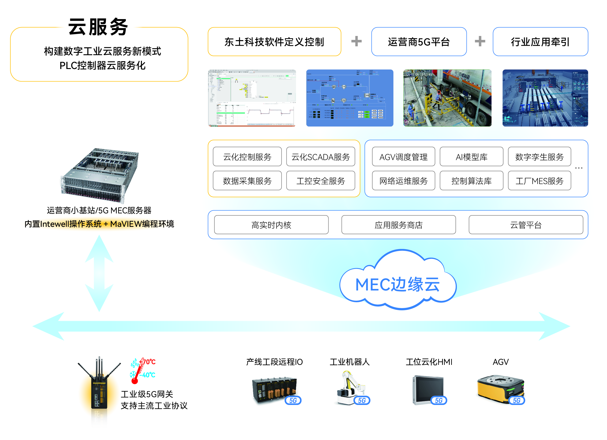 該方案利用5G邊緣智能網(wǎng)關(guān)NewPre2100,通過(guò)5G技術(shù),將現(xiàn)場(chǎng)被控設(shè)備與邊緣MEC服務(wù)器互聯(lián),在MEC服務(wù)器上部署工業(yè)操作系統(tǒng),同時(shí)集成MaVIEW云化控制軟件,充分利用5G網(wǎng)絡(luò)特性,實(shí)現(xiàn)從云端到底層設(shè)備的毫秒級(jí)實(shí)時(shí)控制,并在MEC支撐下進(jìn)行集中設(shè)備管理與數(shù)據(jù)分析應(yīng)用。
