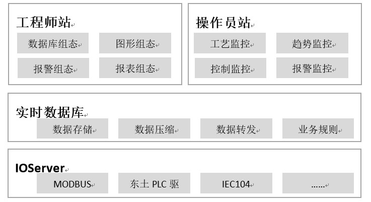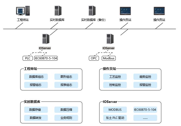 KySCADA工業(yè)互聯(lián)網(wǎng)人機監(jiān)控平臺是東土Intewell工業(yè)互聯(lián)網(wǎng)操作系統(tǒng)的一個重要組成部分,與東土工業(yè)服務器、MaVIEW結合,為用戶提供軟、硬件一體的工業(yè)現(xiàn)場解決方案。KySCADA通過IOServer接入現(xiàn)場設備將數(shù)據(jù)統(tǒng)一存儲到實時數(shù)據(jù)庫進行合并分析與處理,由實時數(shù)據(jù)庫作為整個系統(tǒng)的核心數(shù)據(jù)交換中心,與工程師站、操作員站、IOServer進行通訊。