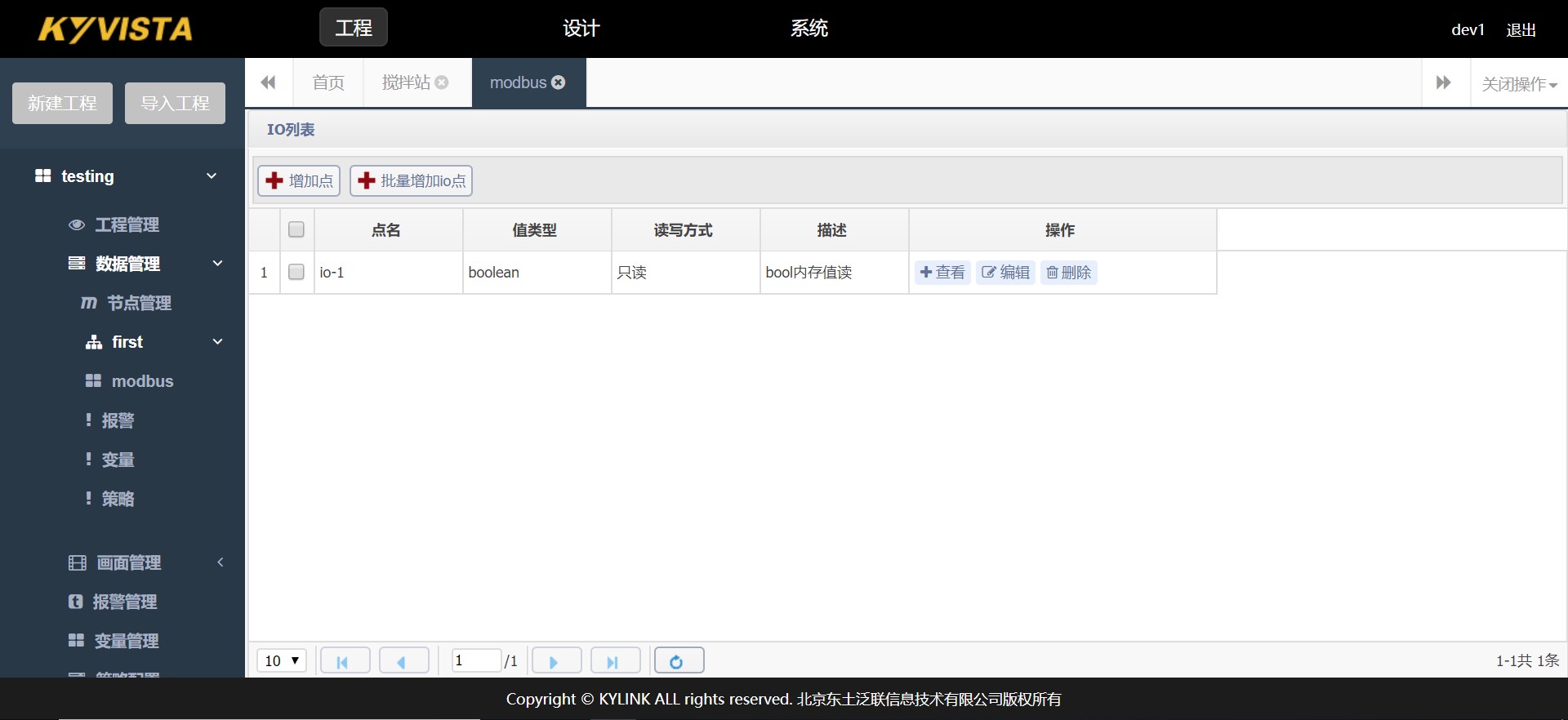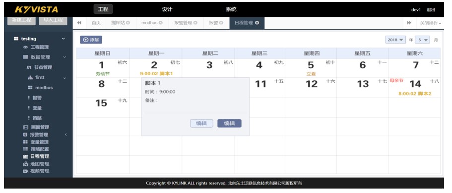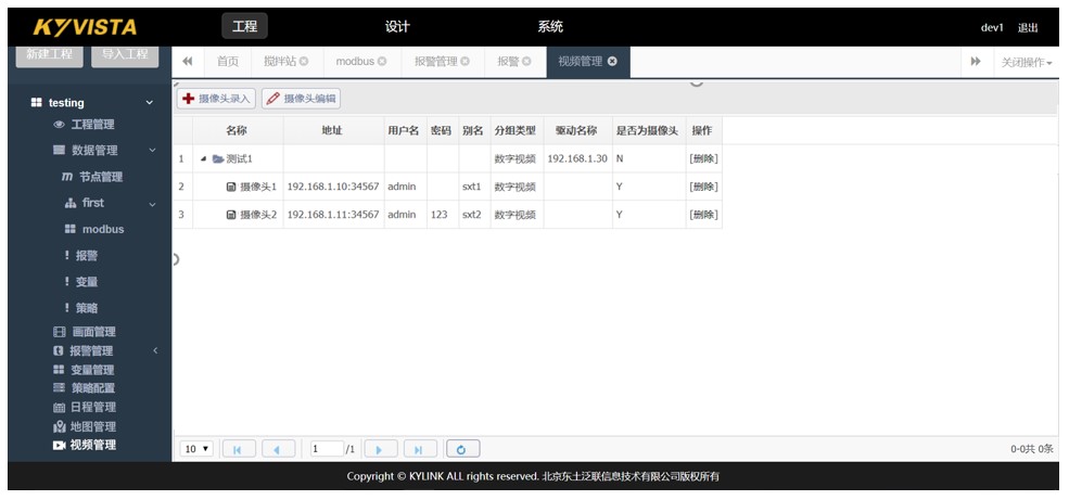 | 數(shù)據(jù)管理 | 支持kyGate網(wǎng)關接入配置管理 支持Modbus TCP協(xié)議配置 支持Modbus ASCII協(xié)議配置 支持OPC DA、OPC UA協(xié)議配置 支持Siemens TCP協(xié)議配置 支持Omron Fins TCP協(xié)議配置 支持數(shù)據(jù)保存配置 支持開關量報警、限值報警配置 支持內(nèi)存變量定義 ![]() |