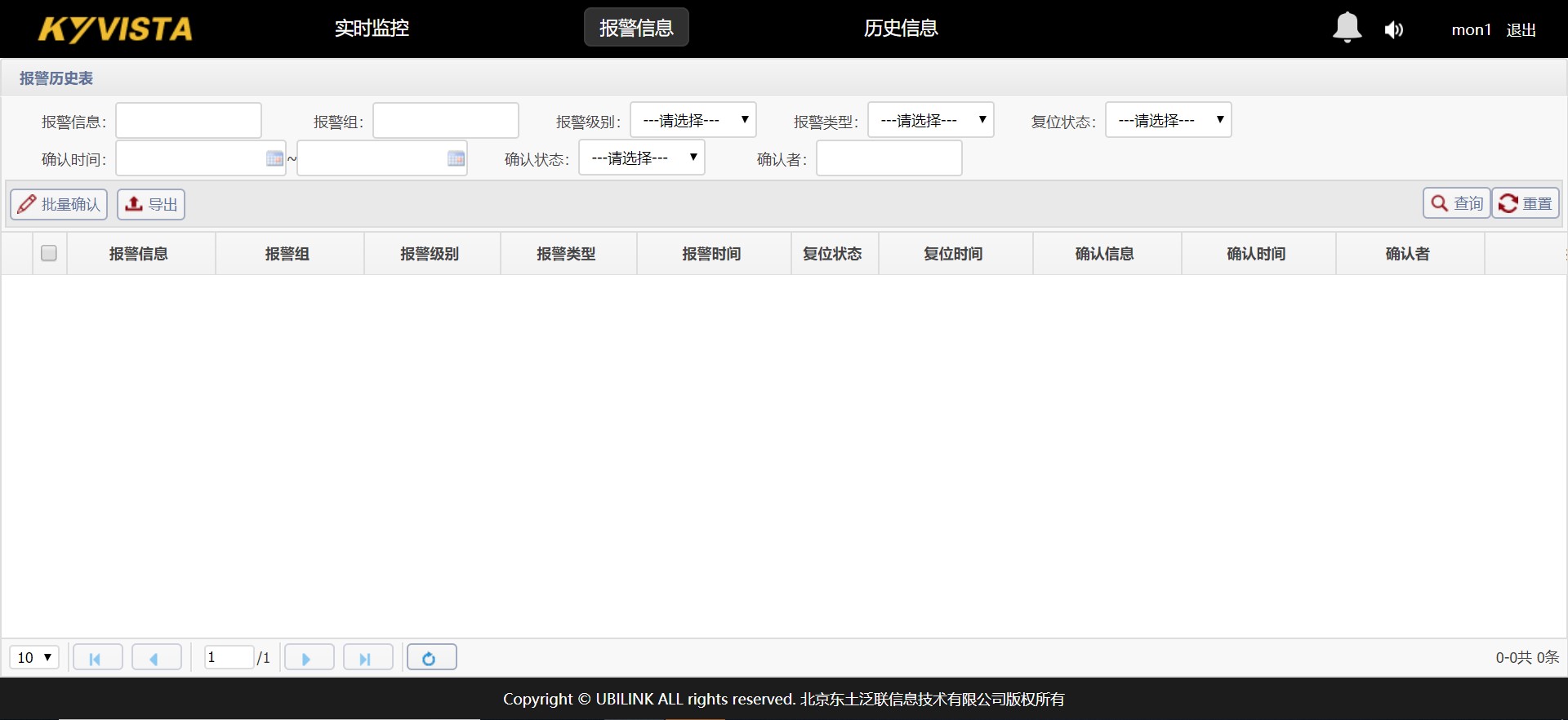 | 報警查詢 | 在瀏覽器上以列表的方式顯示報警 支持對報警按類型、級別查詢 支持用戶對報警確認處理 ![]() |