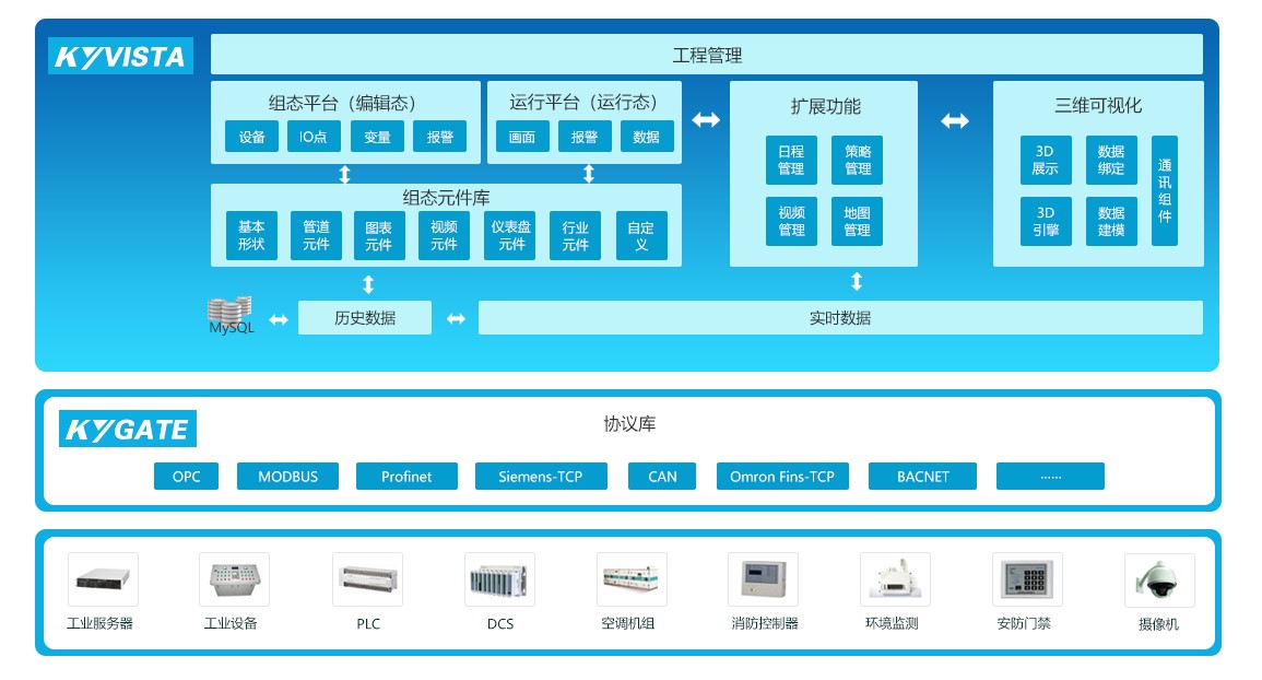 KyVista工業(yè)互聯(lián)網(wǎng)全景可視化集成平臺針對工業(yè)領域多種主流協(xié)議如Modbus (Serial Line and TCP)、OPC XML-DA、OPC UA 、Profibus、Profinet等,進行數(shù)據(jù)采集及轉換,實現(xiàn)工業(yè)數(shù)據(jù)的采集、處理、存儲、遠程配置與監(jiān)控、分析及圖形化展示,并做出智能分析、預警,靈活支持各種工業(yè)應用。