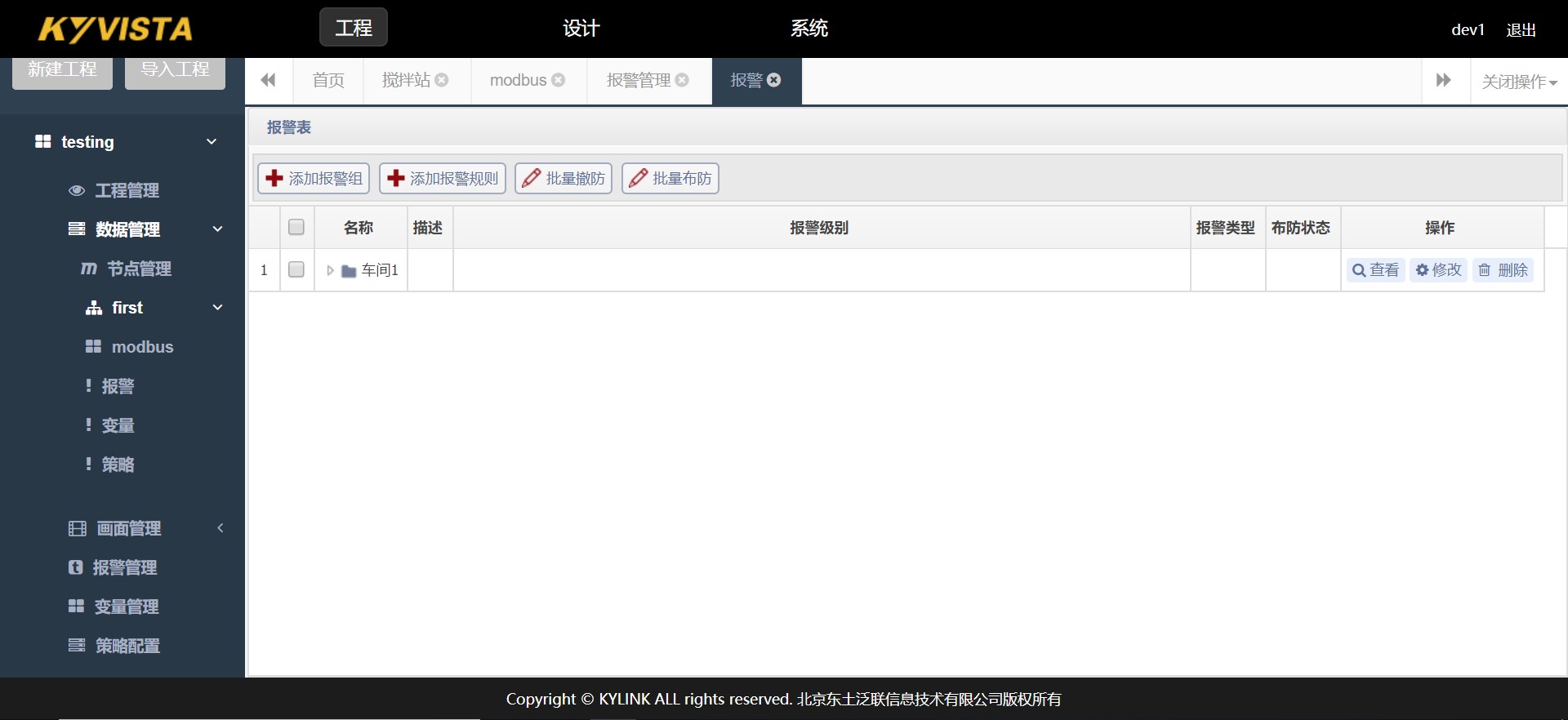 | 報警管理 | 支持用戶自定義表達式報警規(guī)則 根據(jù)規(guī)則產(chǎn)生報警,支持報警復位 ![]() |