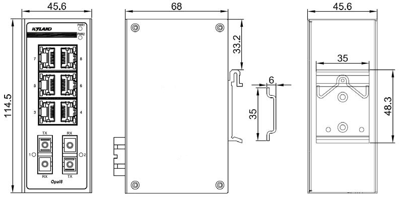 | 機械結(jié)構(gòu) | 外殼 金屬材質(zhì) 散熱方式 自然冷卻,無風(fēng)扇 防護(hù)等級 IP30 尺寸 45.6mm×114.5mm×68mm(W×H×D) 重量 0.3Kg 安裝方式 DIN卡軌式或壁掛式 |