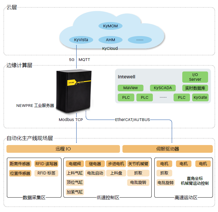 工業(yè)服務(wù)器連接高速運(yùn)動(dòng)區(qū)、低速控制區(qū)、數(shù)據(jù)采集區(qū),同時(shí),運(yùn)行實(shí)時(shí)數(shù)據(jù)庫及設(shè)備管理Agent,數(shù)據(jù)上云,實(shí)現(xiàn)KyMOM 指令的上傳與下達(dá)及工業(yè)服務(wù)器的云端管理(AHM)。