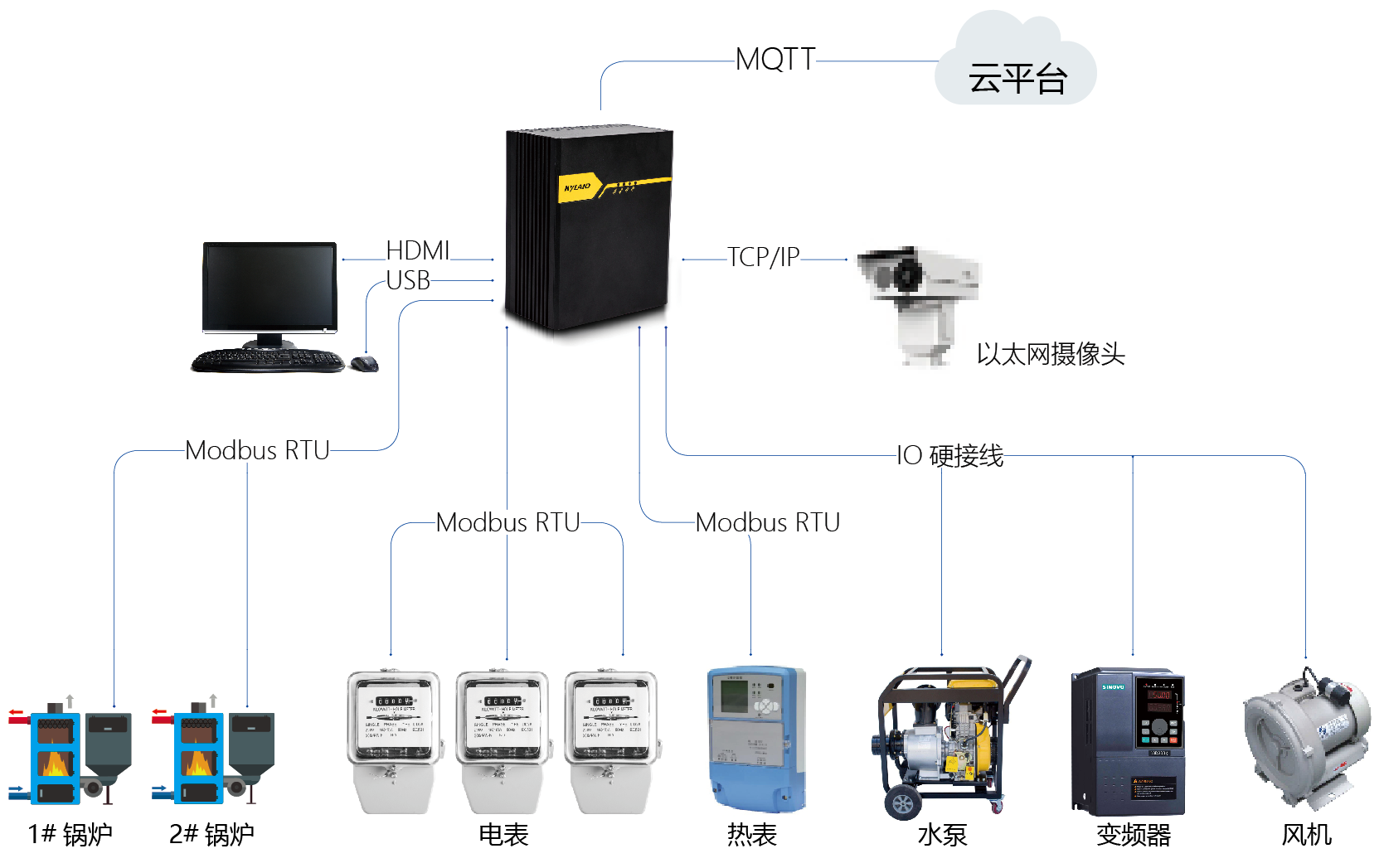 工業(yè)服務(wù)器提供了豐富的接口和協(xié)議。集成常見(jiàn)的Modbus RTU,Modbus TCP, CANopen,EtherCAT, MQTT 等協(xié)議,輕松對(duì)接現(xiàn)場(chǎng)各種專(zhuān)用設(shè)備。非實(shí)時(shí)系統(tǒng)提供KyGate 協(xié)議網(wǎng)關(guān),可將工業(yè)服務(wù)器通過(guò)KyGate 實(shí)現(xiàn)數(shù)據(jù)上云。支持客戶(hù)的網(wǎng)關(guān)應(yīng)用,實(shí)現(xiàn)工業(yè)服務(wù)器對(duì)接客戶(hù)的云平臺(tái)。