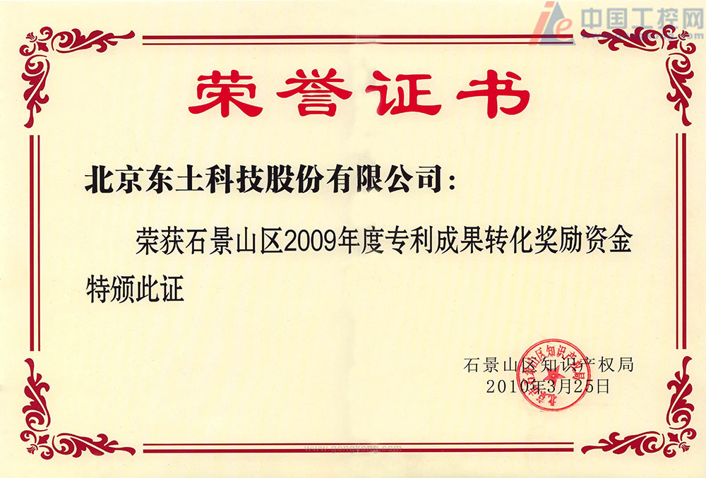 東土科技發(fā)明專利“一種工業(yè)以太網(wǎng)快速冗余的實(shí)現(xiàn)方法”榮獲石景山區(qū)2009年度專利成果轉(zhuǎn)化獎勵資金及榮譽(yù)證書。