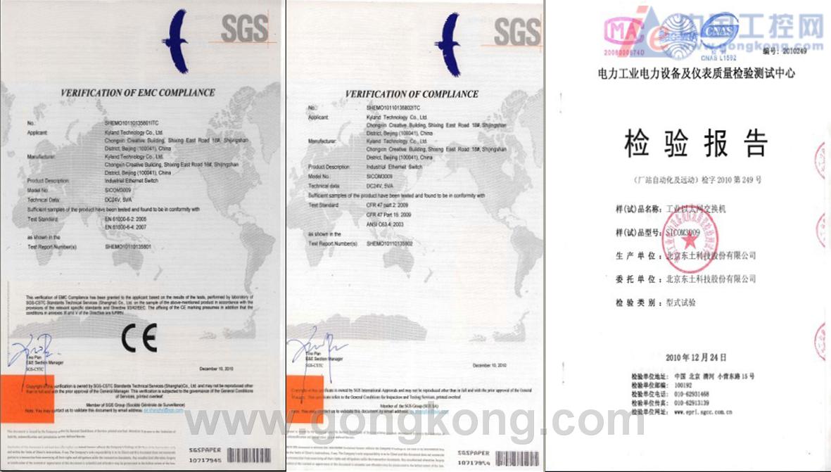 2010年12月23日 Sicom3009卡軌式網管型工業(yè)以太網交換機順利取得由SGS公司測試并認證的CE/FCC報告;并在同時間取得電力工業(yè)電力設備及儀表質量檢驗測試中心的型式試驗報告。