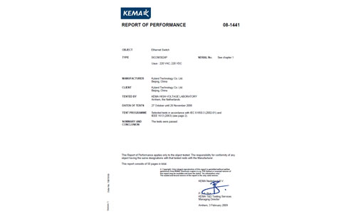 東土自主研發(fā)的SICOM3024P系列工業(yè)以太網(wǎng)交換機在荷蘭KEMA 公司本部順利通過了基于 IEC 61850和 IEEE 1613標準所進行的各項檢測和認證。2009年3月27日,東土科技收到了KEMA公司發(fā)來的書面報告,東土成為國內(nèi)首個通過KEMA認證的工業(yè)以太網(wǎng)交換機生產(chǎn)廠家。