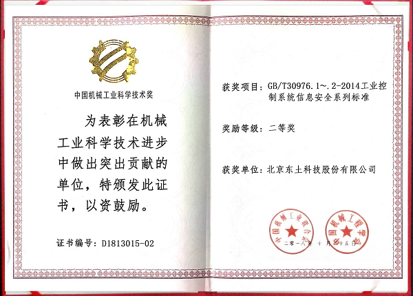 東土科技參與制定的“GB/T30976.1~.2-2014工業(yè)控制系統(tǒng)信息安全系列標準”榮獲中國機械工業(yè)科學技術獎二等獎。