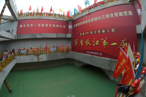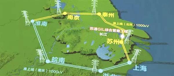 蘇通GIL綜合管廊工程通過(guò)特高壓交流實(shí)現(xiàn)雙環(huán)網(wǎng),兩回1000千伏GIL管線總長(zhǎng)近35公里,形成貫穿皖、蘇、浙、滬負(fù)荷中心的華東特高壓交流環(huán)網(wǎng)。工程以盾構(gòu)隧道方式穿越長(zhǎng)江,這條穿江隧道長(zhǎng)5468.5米,是國(guó)內(nèi)埋深最深、水壓最高的過(guò)江隧道,隧道中預(yù)留了兩回500千伏電纜以及通信、有線電視等市政通用管線,被譽(yù)為電力建設(shè)史上的創(chuàng)舉。