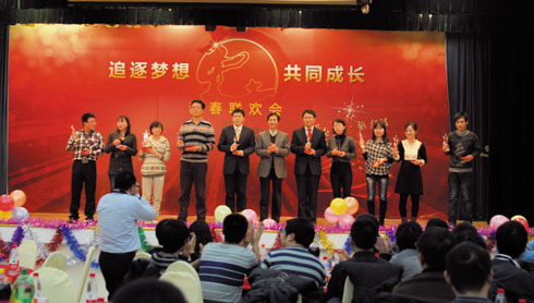 新春聯(lián)歡會(huì)在熱烈喜慶的音樂中拉開帷幕。首先,主持人帶領(lǐng)大家共同回顧了東土科技在2012年取得的驕人成績(jī);接著,公司發(fā)展歷程中的一張張老照片在舒緩的背景音樂中呈現(xiàn)在全體員工的眼前,一幕幕感人的畫面歷歷在目,汩汩暖流涌上心田,正是東土人不畏艱難、不計(jì)得失、敢打敢拼的創(chuàng)業(yè)精神才推動(dòng)?xùn)|土的快速發(fā)展。為了表彰和鼓勵(lì)在2012年工作中表現(xiàn)優(yōu)秀的員工,公司董事長(zhǎng)、總經(jīng)理李平先生為2012年度優(yōu)秀員工頒發(fā)了獎(jiǎng)杯及獎(jiǎng)金,祝賀他們?cè)?012年度取得的優(yōu)異成績(jī)。
