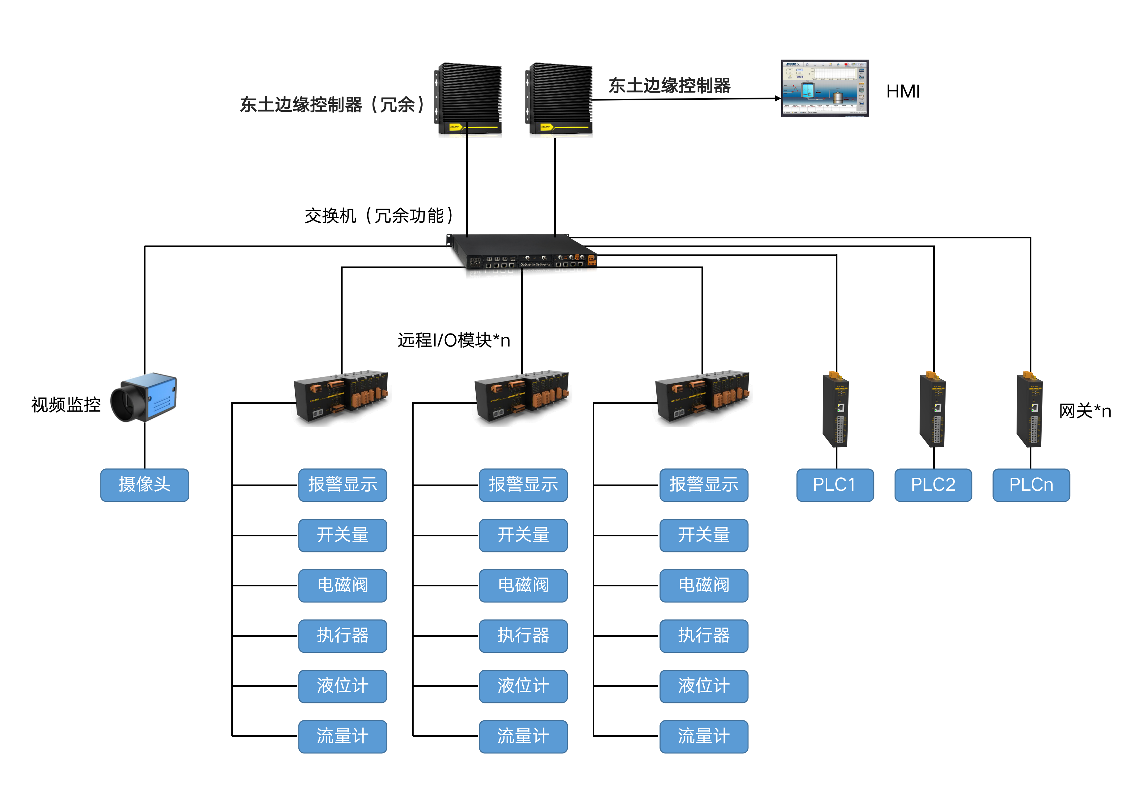 在中石化某大型油氣田現(xiàn)場,將站場原來眾多品牌小規(guī)模PLC及IO產(chǎn)品統(tǒng)一替換成東土邊緣控制器產(chǎn)品,做到自主可控、擴展便利及冗余備份實時控制;利用東土通訊網(wǎng)關(guān)KyGate解決無法與上位建立數(shù)據(jù)交互PLC控制系統(tǒng)連接問題;整合原有SCADA監(jiān)控系統(tǒng),滿足整體統(tǒng)一監(jiān)控、加強數(shù)據(jù)集成分析,并結(jié)合視覺分析建立采油現(xiàn)場安全管控,實現(xiàn)智能控制下沉到工業(yè)現(xiàn)場。