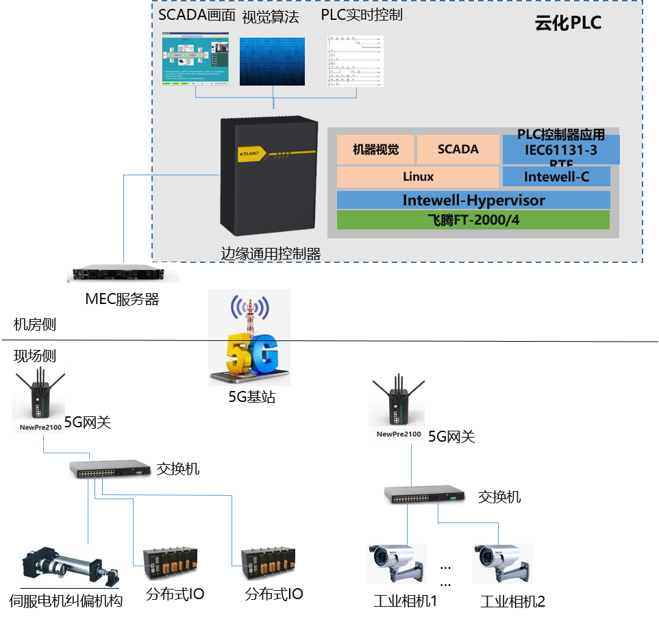 云化控制:引入邊緣計算的系統(tǒng)架構(gòu),將Intewell工業(yè)操作系統(tǒng)、軟件定義控制的視覺算法、運動控制整合到MEC平臺,將傳統(tǒng)工業(yè)控制硬件云化為5G MEC邊緣云軟件系統(tǒng)。