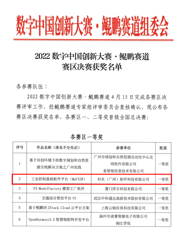 目前,“2022數(shù)字中國創(chuàng)新大賽.鯤鵬賽道”的部分獎(jiǎng)項(xiàng)已揭曉,東土科技旗下子公司——科東(廣州)軟件科技有限公司(以下簡稱科東軟件)憑借“工業(yè)控制基礎(chǔ)平臺(tái)MaVIEW”榮獲華南賽區(qū)一等獎(jiǎng),并成功晉級(jí)全國總決賽。
