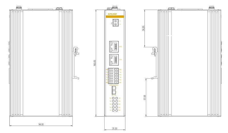 物理特性 | 散熱方式 :自然冷卻,無(wú)風(fēng)扇 防護(hù)等級(jí):IP40 安裝方式:DIN卡軌式 外殼:鋁制型材 設(shè)備尺寸(WxHxD):31×160×94mm 包裝尺寸:70×236×197mm |
