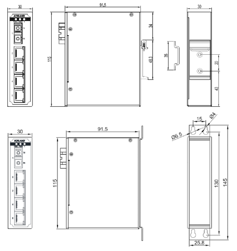 機(jī)械結(jié)構(gòu) | 外殼 金屬材質(zhì) 散熱方式 自然冷卻, 無(wú)風(fēng)扇 防護(hù)等級(jí) IP40 尺寸 30mm×115mm×91.5mm (W×H×D) 重量 0.46Kg 安裝方式 DIN卡軌式或壁掛式 |