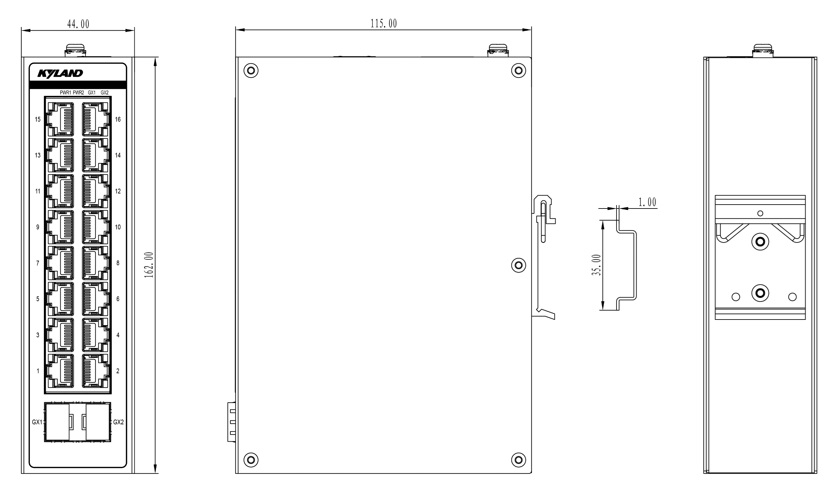 機(jī)械結(jié)構(gòu) | 外殼 金屬材質(zhì) 散熱方式 自然冷卻,無風(fēng)扇 防護(hù)等級 IP40 尺寸 44mm×162mm×115mm (W×H×D) 重量 0.5Kg 安裝方式 DIN卡軌式或壁掛式 |