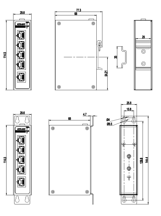 機(jī)械結(jié)構(gòu) | 外殼 金屬材質(zhì) 散熱方式 自然冷卻,無風(fēng)扇 防護(hù)等級 IP40 尺寸 29.6mm×114.5mm×68mm(5T), 31mm×114.5mm×94mm(1SFP4T) (W×H×D) 重量 0.2Kg(5T), 0.3Kg (1SFP4T) 安裝方式 DIN卡軌式或壁掛式 |